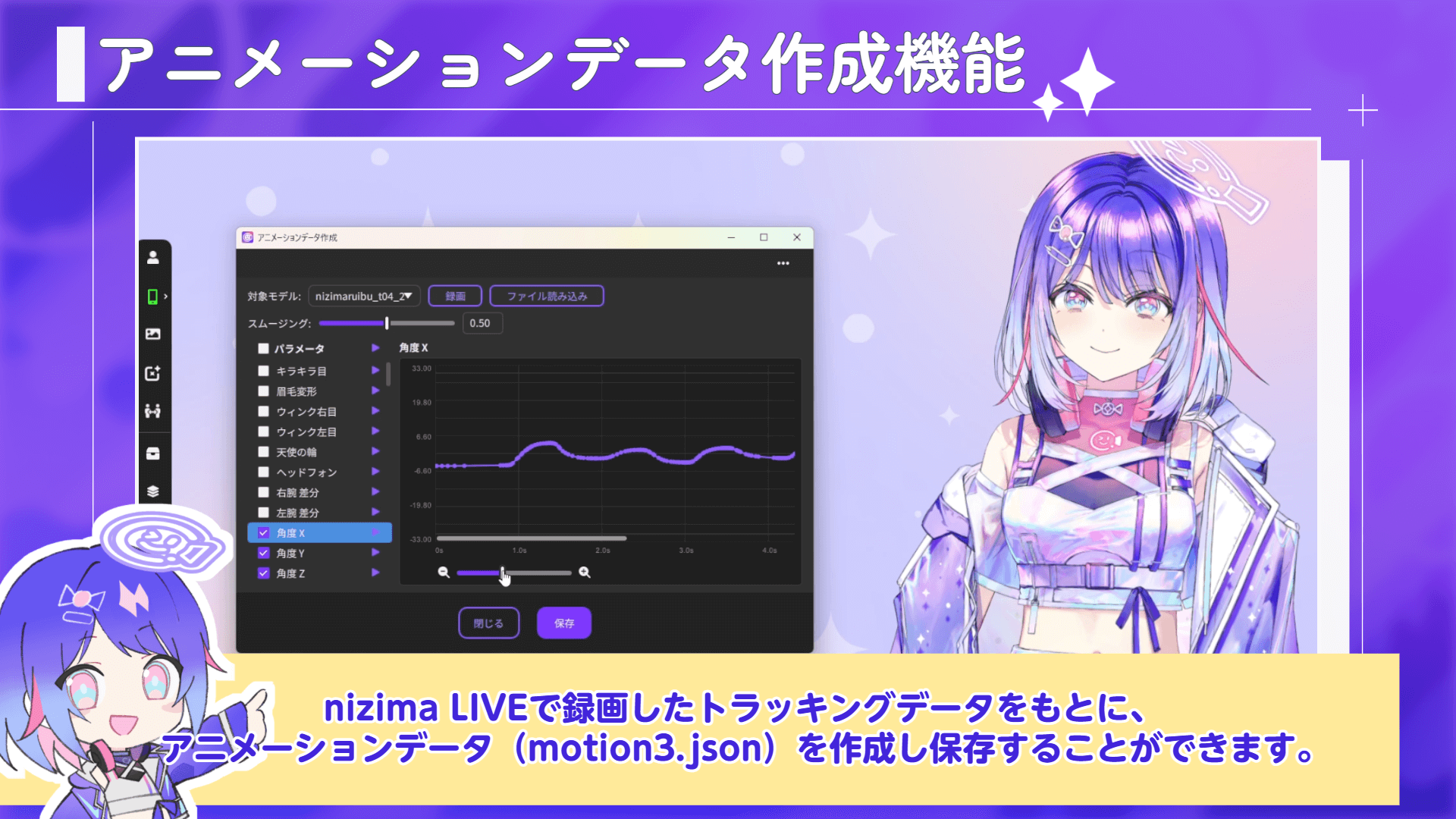 nizima LIVEで録画したトラッキングデータをもとに、アニメーションデータ(motion3.json)を作成し保存することができます。